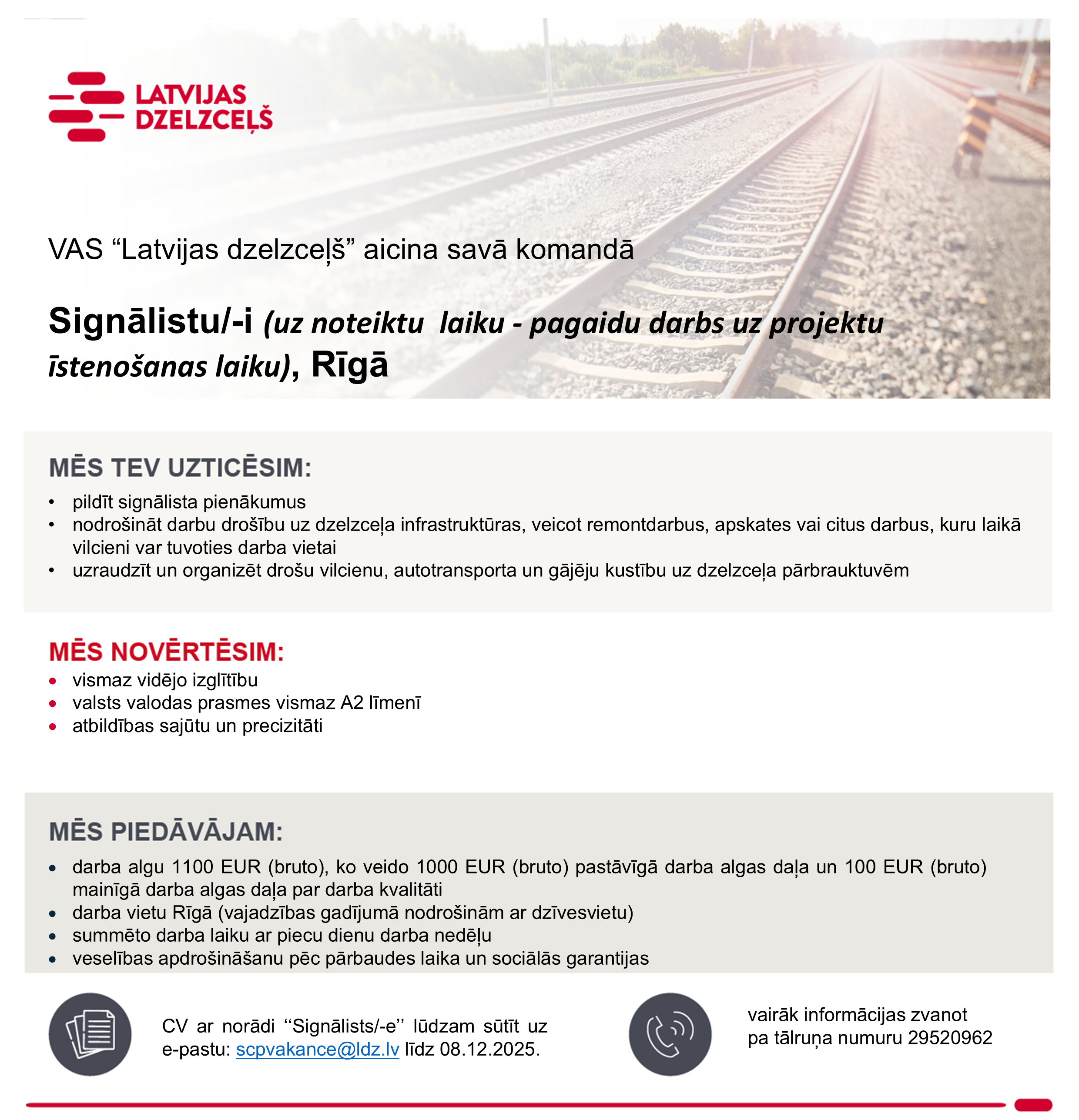 Piesakoties amata vakancei pretendents apliecina, ka sniegtie dati ir patiesi un piekrīt, ka Koncerns “Latvijas dzelzceļš” veiks šo datu apstrādi darbā iekārtošanās nolūkā. Mēs iesniegtos datus uzglabāsim VAS “Latvijas dzelzceļš” datu bāzē 1 gadu pēc konkursa beigām ar mērķi nodrošināt savu tiesību aizsardzību. Iesūtot datus, pretendents var izteikt piekrišanu savu datu uzglabāšanai Koncerna “Latvijas dzelzceļš” datu bāzē 1 gadu, lai tos izmantotu arī citos Koncerna “Latvijas dzelzceļš” sabiedrībās piemērotu vakanču personāla atlases procesos. Pēc pretendenta pieprasījuma, personas dati var tikt dzēsti jebkurā brīdī, informāciju sūtot e-pastu – datuaizsardziba[at]ldz.lv.Privātuma politika.