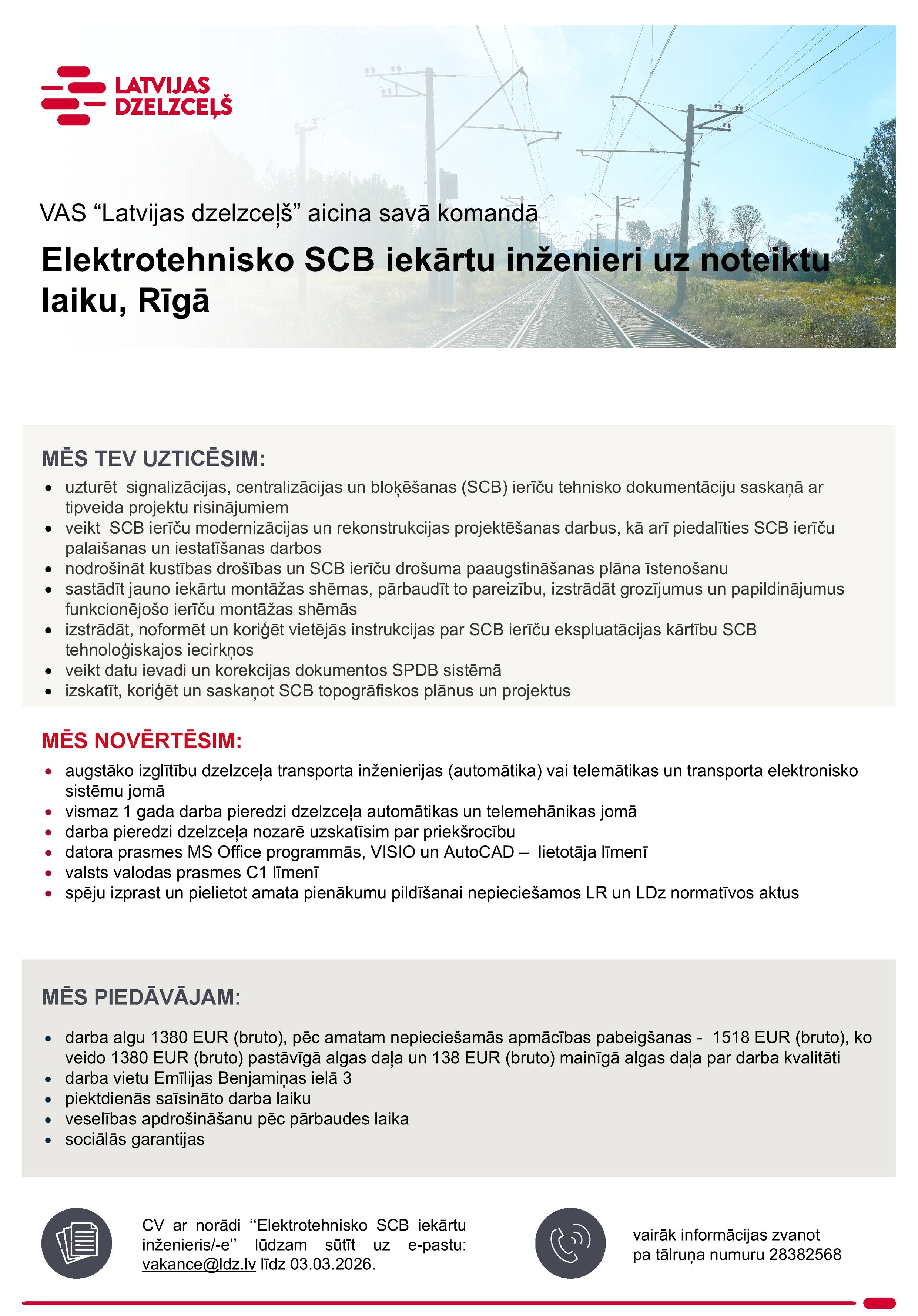 Piesakoties amata vakancei pretendents apliecina, ka sniegtie dati ir patiesi un piekrīt, ka Koncerns “Latvijas dzelzceļš” veiks šo datu apstrādi darbā iekārtošanās nolūkā. Mēs iesniegtos datus uzglabāsim VAS “Latvijas dzelzceļš” datu bāzē 1 gadu pēc konkursa beigām ar mērķi nodrošināt savu tiesību aizsardzību. Iesūtot datus, pretendents var izteikt piekrišanu savu datu uzglabāšanai Koncerna “Latvijas dzelzceļš” datu bāzē 1 gadu, lai tos izmantotu arī citos Koncerna “Latvijas dzelzceļš” sabiedrībās piemērotu vakanču personāla atlases procesos. Pēc pretendenta pieprasījuma, personas dati var tikt dzēsti jebkurā brīdī, informāciju sūtot e-pastu – datuaizsardziba[at]ldz.lv.Privātuma politika.