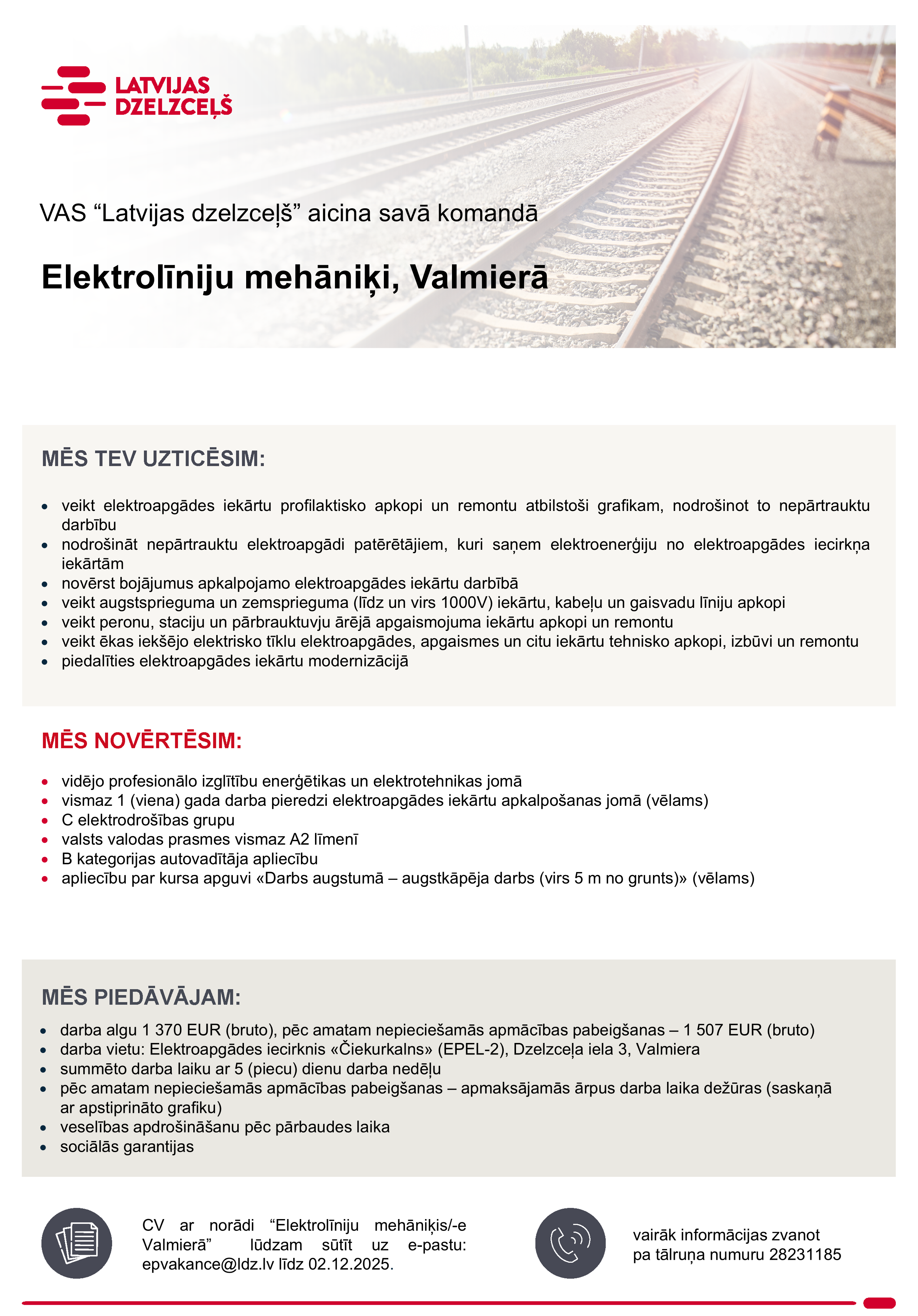 Piesakoties amata vakancei pretendents apliecina, ka sniegtie dati ir patiesi un piekrīt, ka Koncerns “Latvijas dzelzceļš” veiks šo datu apstrādi darbā iekārtošanās nolūkā. Mēs iesniegtos datus uzglabāsim VAS “Latvijas dzelzceļš” datu bāzē 1 gadu pēc konkursa beigām ar mērķi nodrošināt savu tiesību aizsardzību. Iesūtot datus, pretendents var izteikt piekrišanu savu datu uzglabāšanai Koncerna “Latvijas dzelzceļš” datu bāzē 1 gadu, lai tos izmantotu arī citos Koncerna “Latvijas dzelzceļš” sabiedrībās piemērotu vakanču personāla atlases procesos. Pēc pretendenta pieprasījuma, personas dati var tikt dzēsti jebkurā brīdī, informāciju sūtot uz e-pastu – datuaizsardziba[at]ldz.lv.Privātuma politika.