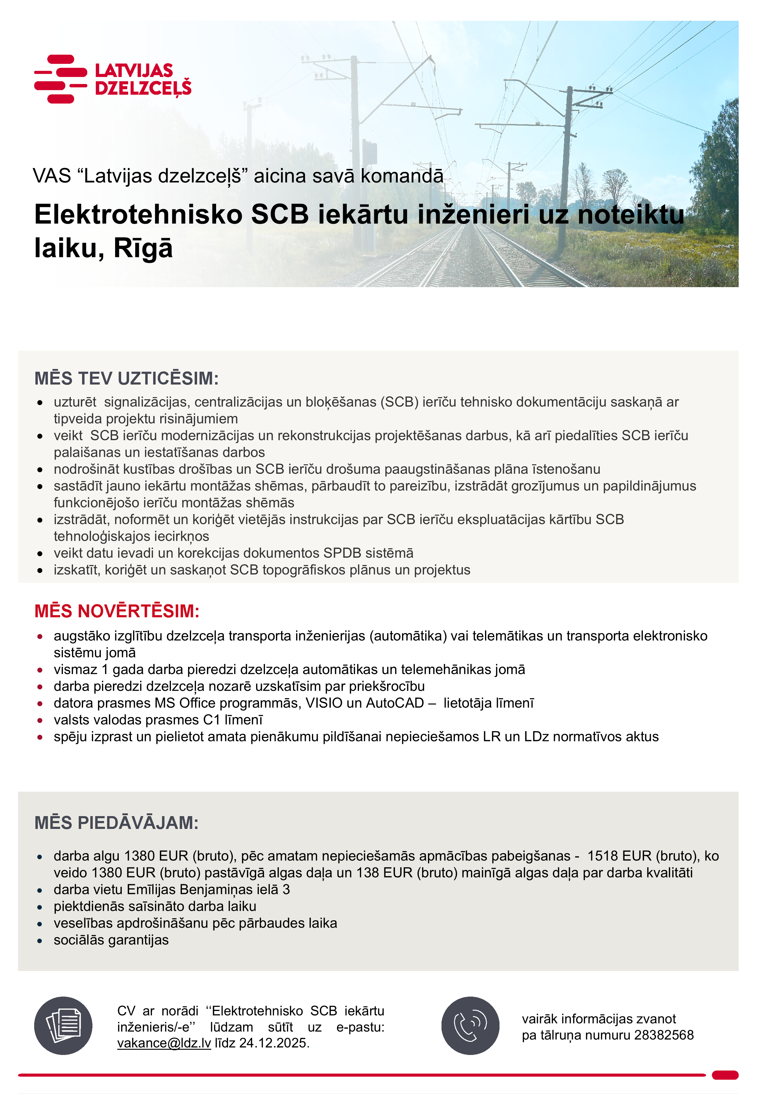 Piesakoties amata vakancei pretendents apliecina, ka sniegtie dati ir patiesi un piekrīt, ka Koncerns “Latvijas dzelzceļš” veiks šo datu apstrādi darbā iekārtošanās nolūkā. Mēs iesniegtos datus uzglabāsim VAS “Latvijas dzelzceļš” datu bāzē 1 gadu pēc konkursa beigām ar mērķi nodrošināt savu tiesību aizsardzību. Iesūtot datus, pretendents var izteikt piekrišanu savu datu uzglabāšanai Koncerna “Latvijas dzelzceļš” datu bāzē 1 gadu, lai tos izmantotu arī citos Koncerna “Latvijas dzelzceļš” sabiedrībās piemērotu vakanču personāla atlases procesos. Pēc pretendenta pieprasījuma, personas dati var tikt dzēsti jebkurā brīdī, informāciju sūtot e-pastu – datuaizsardziba[at]ldz.lv.Privātuma politika.