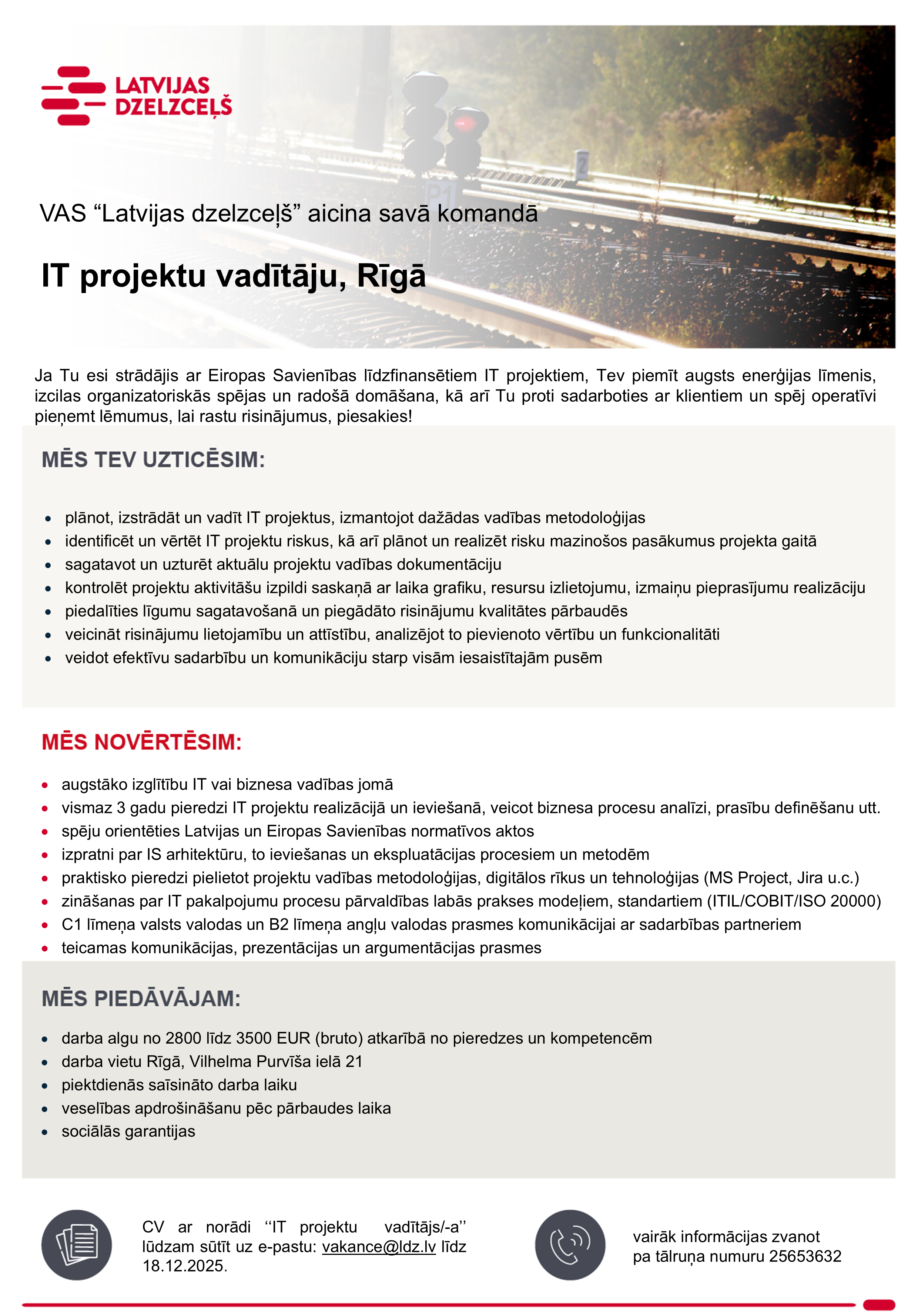 Piesakoties amata vakancei pretendents apliecina, ka sniegtie dati ir patiesi un piekrīt, ka Koncerns “Latvijas dzelzceļš” veiks šo datu apstrādi darbā iekārtošanās nolūkā. Mēs iesniegtos datus uzglabāsim VAS “Latvijas dzelzceļš” datu bāzē 1 gadu pēc konkursa beigām ar mērķi nodrošināt savu tiesību aizsardzību. Iesūtot datus, pretendents var izteikt piekrišanu savu datu uzglabāšanai Koncerna “Latvijas dzelzceļš” datu bāzē 1 gadu, lai tos izmantotu arī citos Koncerna “Latvijas dzelzceļš” sabiedrībās piemērotu vakanču personāla atlases procesos. Pēc pretendenta pieprasījuma, personas dati var tikt dzēsti jebkurā brīdī, informāciju sūtot e-pastu – datuaizsardziba[at]ldz.lv.Privātuma politika.