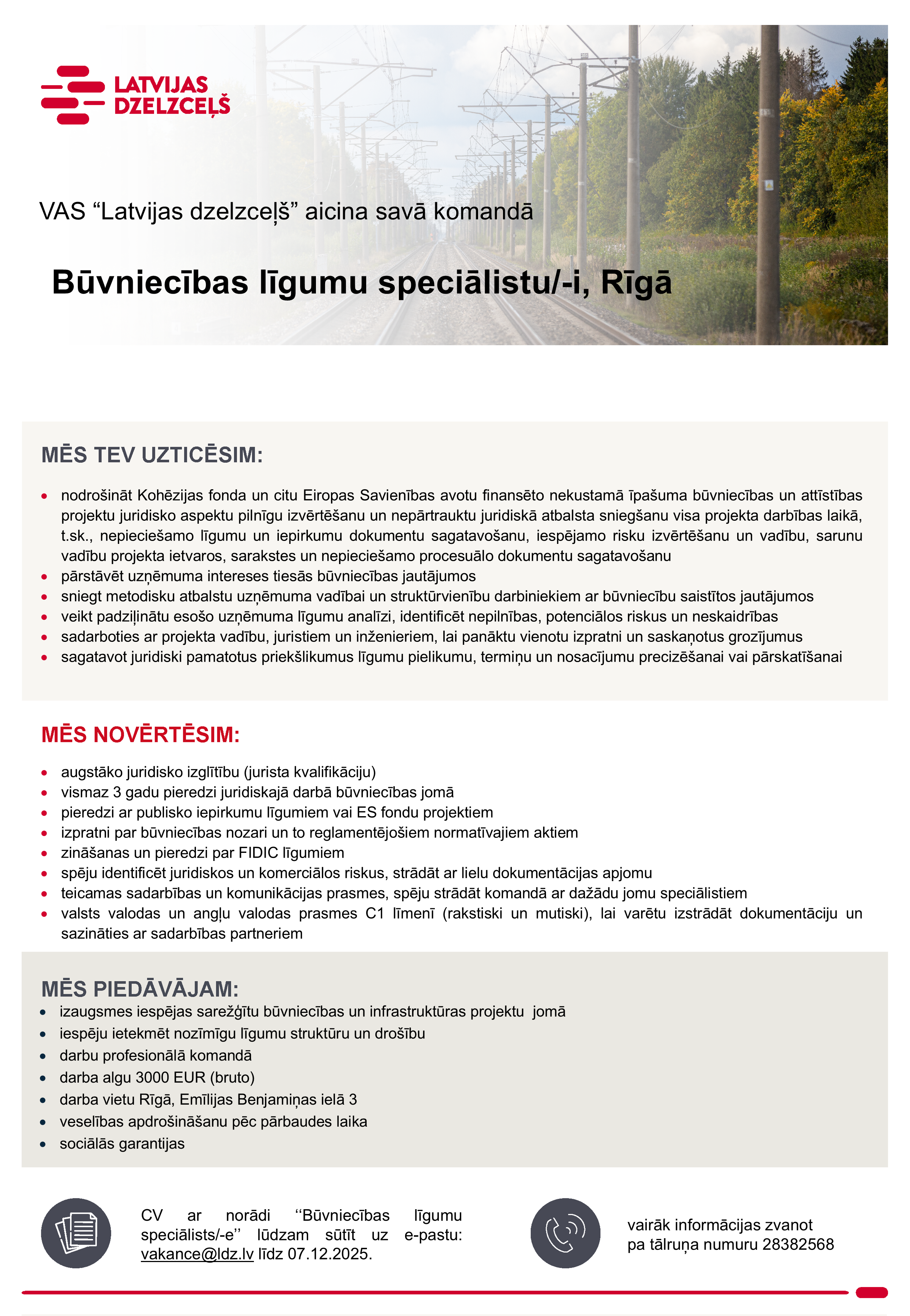 Piesakoties amata vakancei pretendents apliecina, ka sniegtie dati ir patiesi un piekrīt, ka Koncerns “Latvijas dzelzceļš” veiks šo datu apstrādi darbā iekārtošanās nolūkā. Mēs iesniegtos datus uzglabāsim VAS “Latvijas dzelzceļš” datu bāzē 1 gadu pēc konkursa beigām ar mērķi nodrošināt savu tiesību aizsardzību. Iesūtot datus, pretendents var izteikt piekrišanu savu datu uzglabāšanai Koncerna “Latvijas dzelzceļš” datu bāzē 1 gadu, lai tos izmantotu arī citos Koncerna “Latvijas dzelzceļš” sabiedrībās piemērotu vakanču personāla atlases procesos. Pēc pretendenta pieprasījuma, personas dati var tikt dzēsti jebkurā brīdī, informāciju sūtot e-pastu – datuaizsardziba[at]ldz.lv.Privātuma politika.