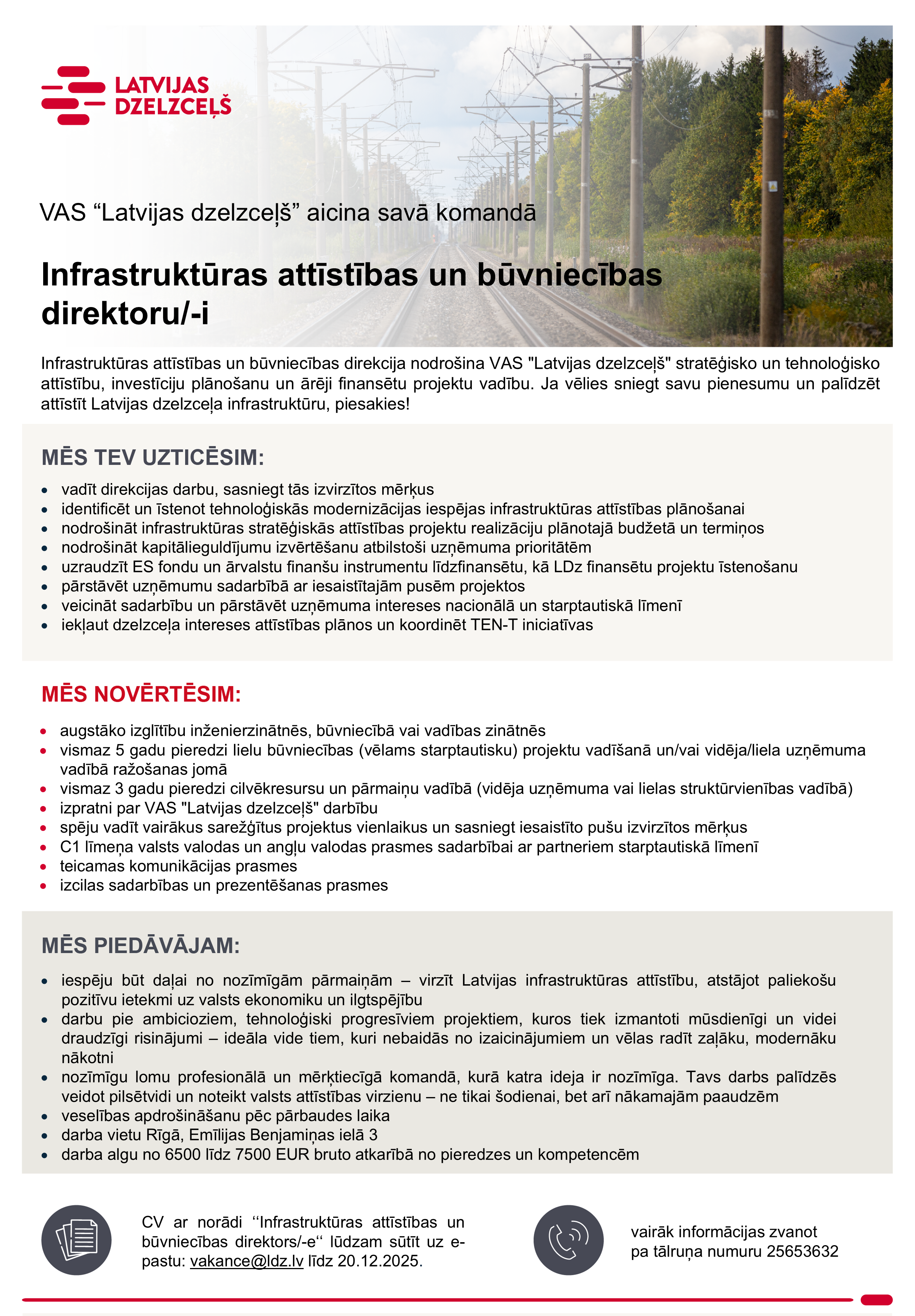 Piesakoties amata vakancei pretendents apliecina, ka sniegtie dati ir patiesi un piekrīt, ka Koncerns “Latvijas dzelzceļš” veiks šo datu apstrādi darbā iekārtošanās nolūkā. Mēs iesniegtos datus uzglabāsim VAS “Latvijas dzelzceļš” datu bāzē 1 gadu pēc konkursa beigām ar mērķi nodrošināt savu tiesību aizsardzību. Iesūtot datus, pretendents var izteikt piekrišanu savu datu uzglabāšanai Koncerna “Latvijas dzelzceļš” datu bāzē 1 gadu, lai tos izmantotu arī citos Koncerna “Latvijas dzelzceļš” sabiedrībās piemērotu vakanču personāla atlases procesos. Pēc pretendenta pieprasījuma, personas dati var tikt dzēsti jebkurā brīdī, informāciju sūtot e-pastu – datuaizsardziba[at]ldz.lv.Privātuma politika.