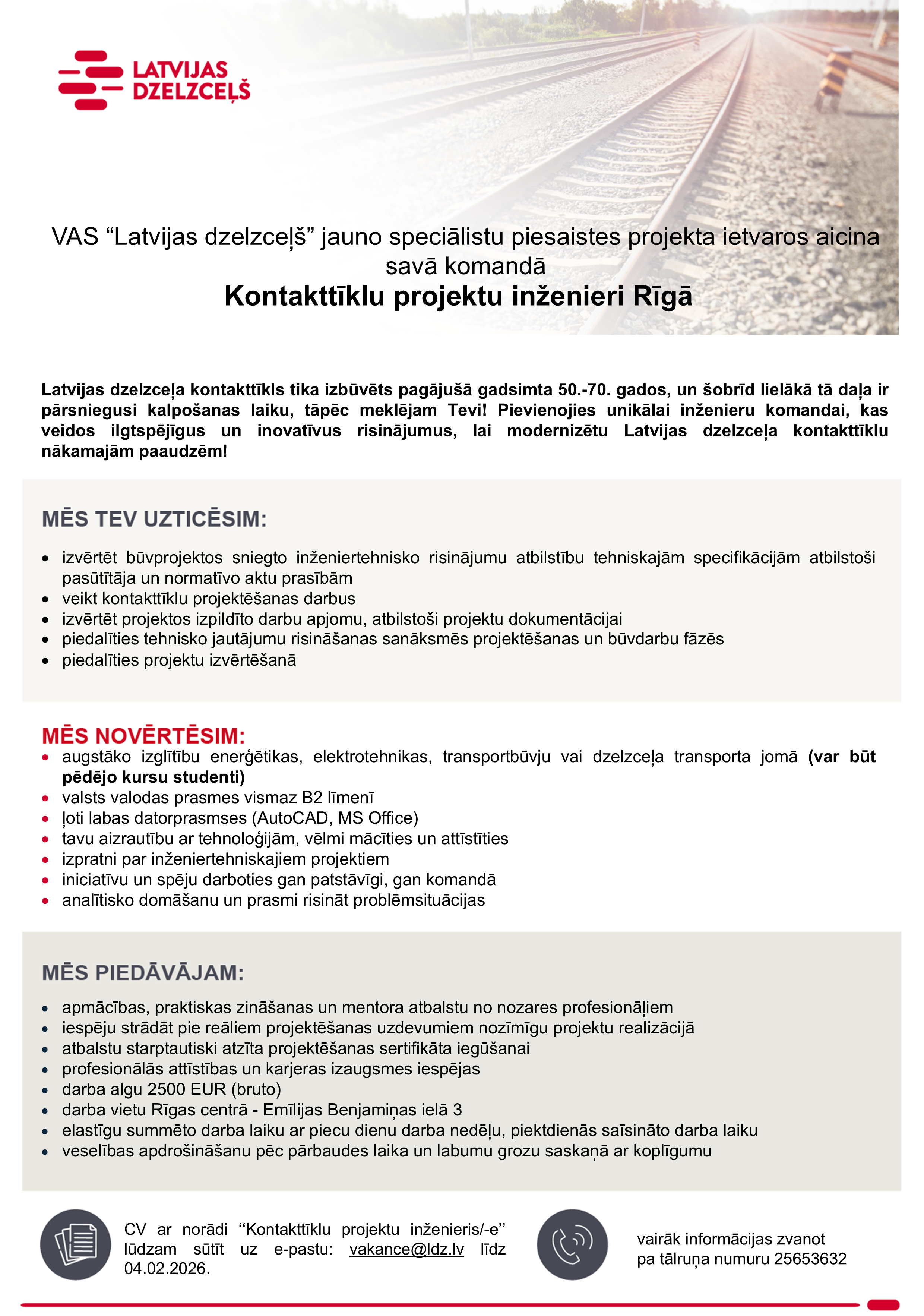 Piesakoties amata vakancei pretendents apliecina, ka sniegtie dati ir patiesi un piekrīt, ka Koncerns “Latvijas dzelzceļš” veiks šo datu apstrādi darbā iekārtošanās nolūkā. Mēs iesniegtos datus uzglabāsim VAS “Latvijas dzelzceļš” datu bāzē 1 gadu pēc konkursa beigām ar mērķi nodrošināt savu tiesību aizsardzību. Iesūtot datus, pretendents var izteikt piekrišanu savu datu uzglabāšanai Koncerna “Latvijas dzelzceļš” datu bāzē 1 gadu, lai tos izmantotu arī citos Koncerna “Latvijas dzelzceļš” sabiedrībās piemērotu vakanču personāla atlases procesos. Pēc pretendenta pieprasījuma, personas dati var tikt dzēsti jebkurā brīdī, informāciju sūtot e-pastu – datuaizsardziba[at]ldz.lv.Privātuma politika.