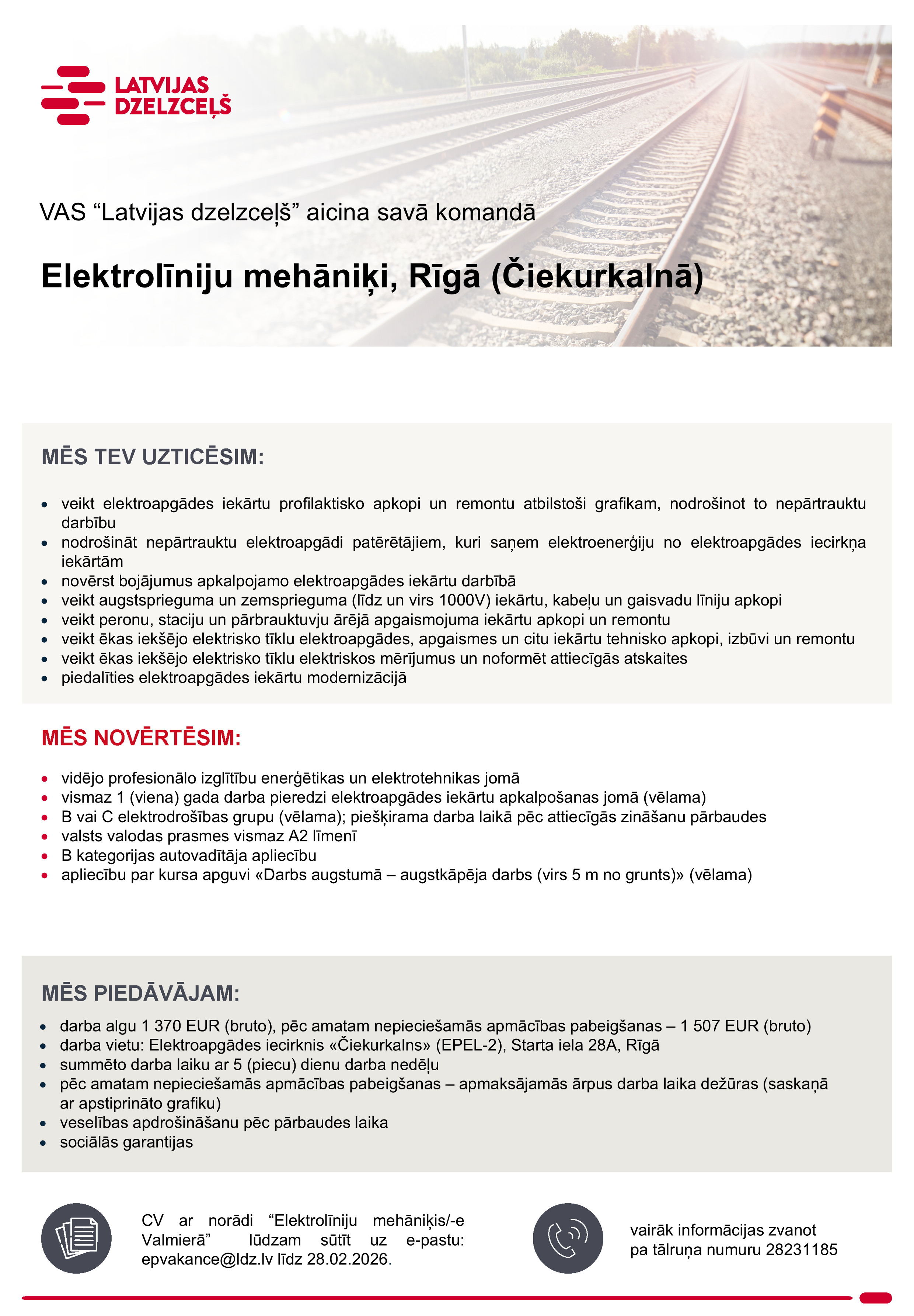 Piesakoties amata vakancei pretendents apliecina, ka sniegtie dati ir patiesi un piekrīt, ka Koncerns “Latvijas dzelzceļš” veiks šo datu apstrādi darbā iekārtošanās nolūkā. Mēs iesniegtos datus uzglabāsim VAS “Latvijas dzelzceļš” datu bāzē 1 gadu pēc konkursa beigām ar mērķi nodrošināt savu tiesību aizsardzību. Iesūtot datus, pretendents var izteikt piekrišanu savu datu uzglabāšanai Koncerna “Latvijas dzelzceļš” datu bāzē 1 gadu, lai tos izmantotu arī citos Koncerna “Latvijas dzelzceļš” sabiedrībās piemērotu vakanču personāla atlases procesos. Pēc pretendenta pieprasījuma, personas dati var tikt dzēsti jebkurā brīdī, informāciju sūtot uz e-pastu – datuaizsardziba[at]ldz.lv.Privātuma politika.