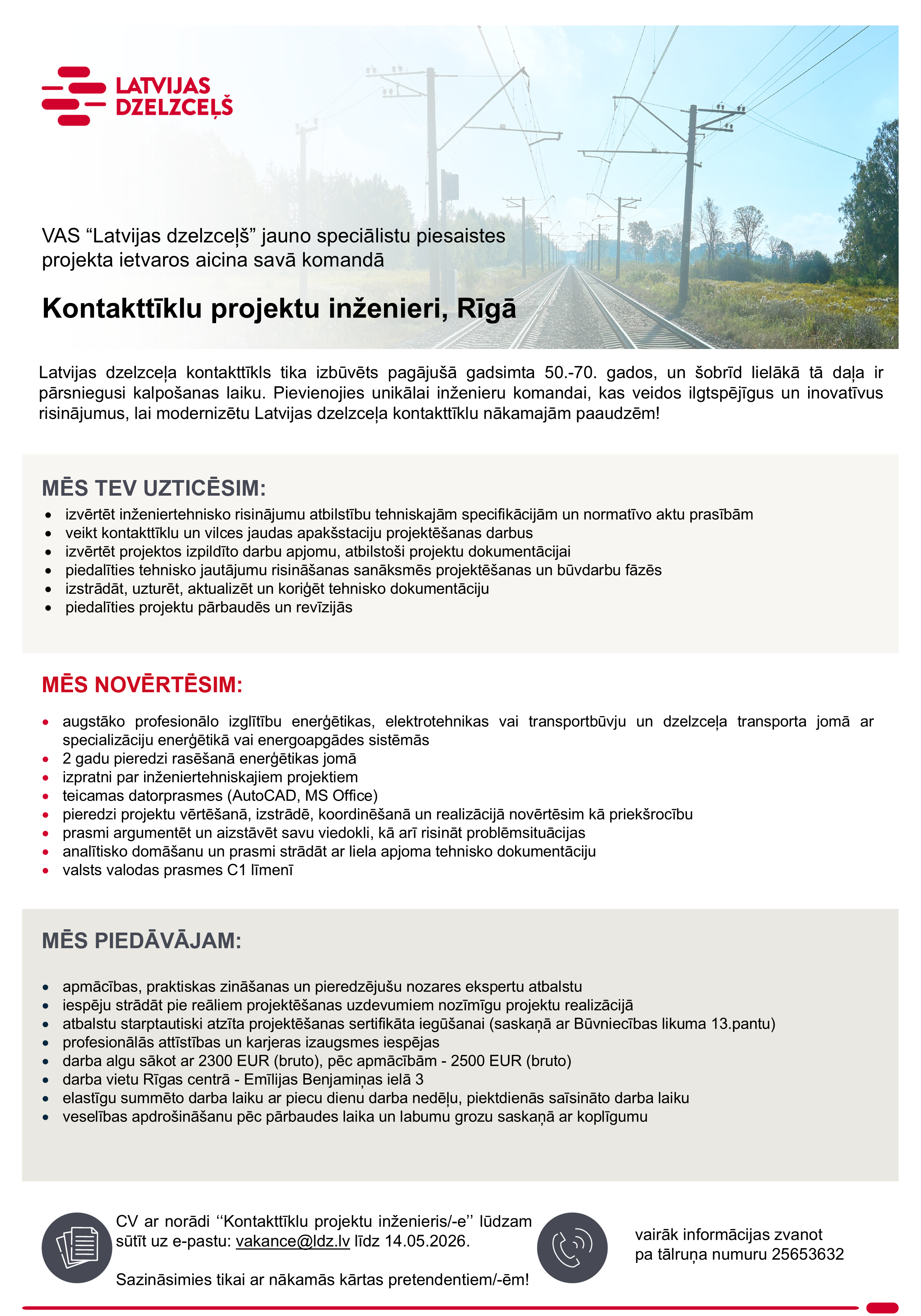 Piesakoties amata vakancei pretendents apliecina, ka sniegtie dati ir patiesi un piekrīt, ka Koncerns “Latvijas dzelzceļš” veiks šo datu apstrādi darbā iekārtošanās nolūkā. Mēs iesniegtos datus uzglabāsim VAS “Latvijas dzelzceļš” datu bāzē 1 gadu pēc konkursa beigām ar mērķi nodrošināt savu tiesību aizsardzību. Iesūtot datus, pretendents var izteikt piekrišanu savu datu uzglabāšanai Koncerna “Latvijas dzelzceļš” datu bāzē 1 gadu, lai tos izmantotu arī citos Koncerna “Latvijas dzelzceļš” sabiedrībās piemērotu vakanču personāla atlases procesos. Pēc pretendenta pieprasījuma, personas dati var tikt dzēsti jebkurā brīdī, informāciju sūtot e-pastu – datuaizsardziba[at]ldz.lv.Privātuma politika.