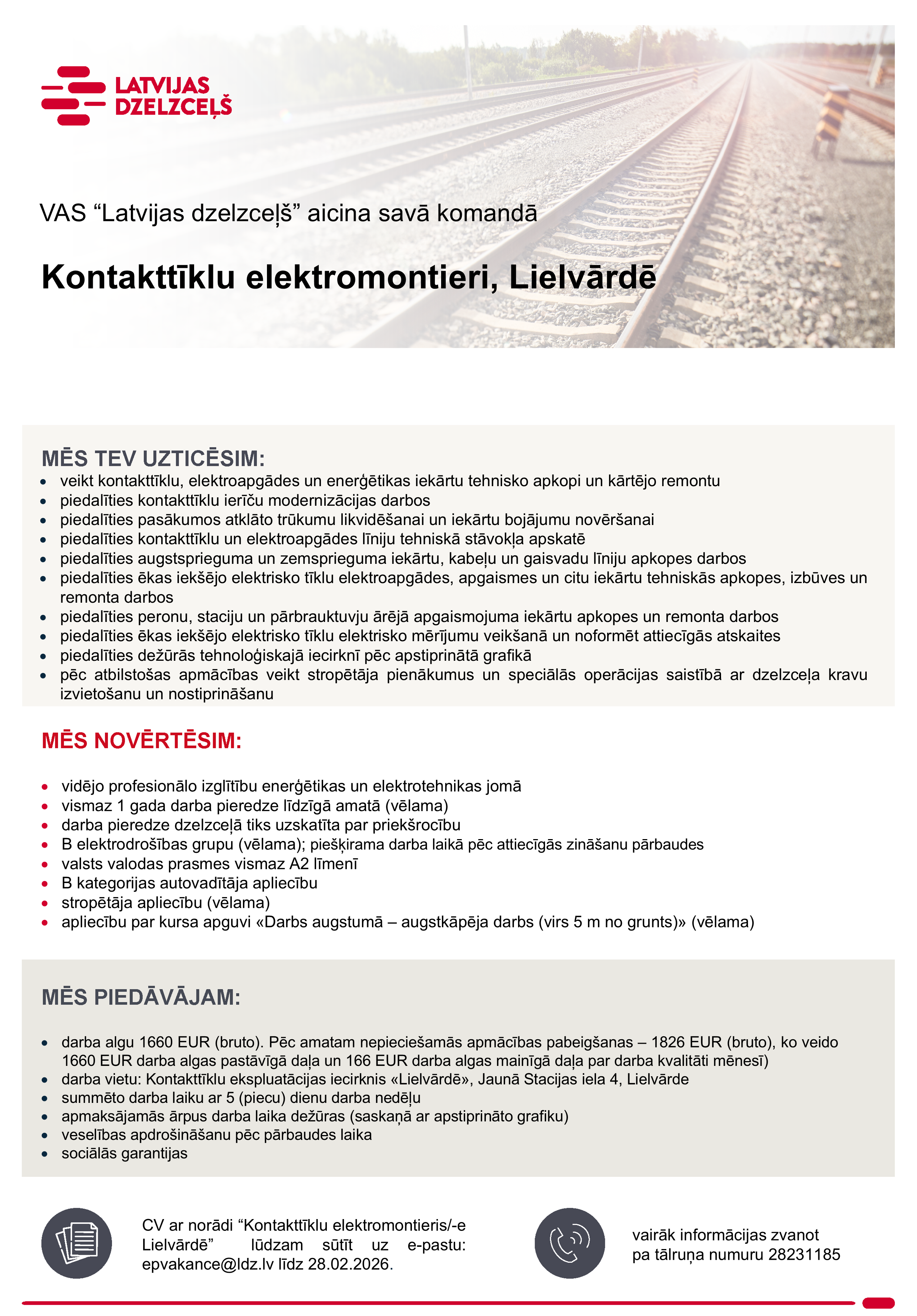 Piesakoties amata vakancei pretendents apliecina, ka sniegtie dati ir patiesi un piekrīt, ka Koncerns “Latvijas dzelzceļš” veiks šo datu apstrādi darbā iekārtošanās nolūkā. Mēs iesniegtos datus uzglabāsim VAS “Latvijas dzelzceļš” datu bāzē 1 gadu pēc konkursa beigām ar mērķi nodrošināt savu tiesību aizsardzību. Iesūtot datus, pretendents var izteikt piekrišanu savu datu uzglabāšanai Koncerna “Latvijas dzelzceļš” datu bāzē 1 gadu, lai tos izmantotu arī citos Koncerna “Latvijas dzelzceļš” sabiedrībās piemērotu vakanču personāla atlases procesos. Pēc pretendenta pieprasījuma, personas dati var tikt dzēsti jebkurā brīdī, informāciju sūtot uz e-pastu – datuaizsardziba[at]ldz.lv.Privātuma politika.