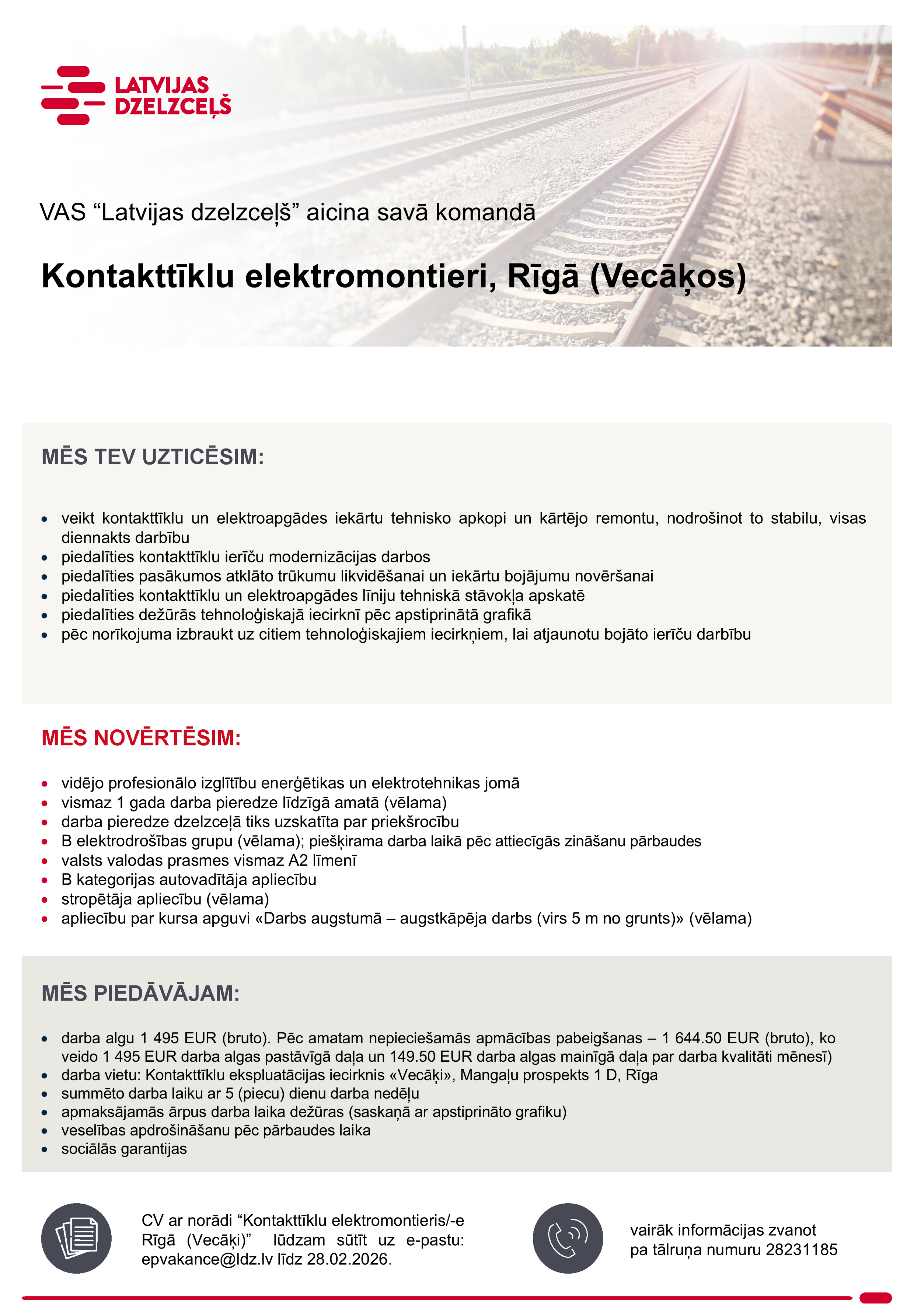Piesakoties amata vakancei pretendents apliecina, ka sniegtie dati ir patiesi un piekrīt, ka Koncerns “Latvijas dzelzceļš” veiks šo datu apstrādi darbā iekārtošanās nolūkā. Mēs iesniegtos datus uzglabāsim VAS “Latvijas dzelzceļš” datu bāzē 1 gadu pēc konkursa beigām ar mērķi nodrošināt savu tiesību aizsardzību. Iesūtot datus, pretendents var izteikt piekrišanu savu datu uzglabāšanai Koncerna “Latvijas dzelzceļš” datu bāzē 1 gadu, lai tos izmantotu arī citos Koncerna “Latvijas dzelzceļš” sabiedrībās piemērotu vakanču personāla atlases procesos. Pēc pretendenta pieprasījuma, personas dati var tikt dzēsti jebkurā brīdī, informāciju sūtot uz e-pastu – datuaizsardziba[at]ldz.lv.Privātuma politika.