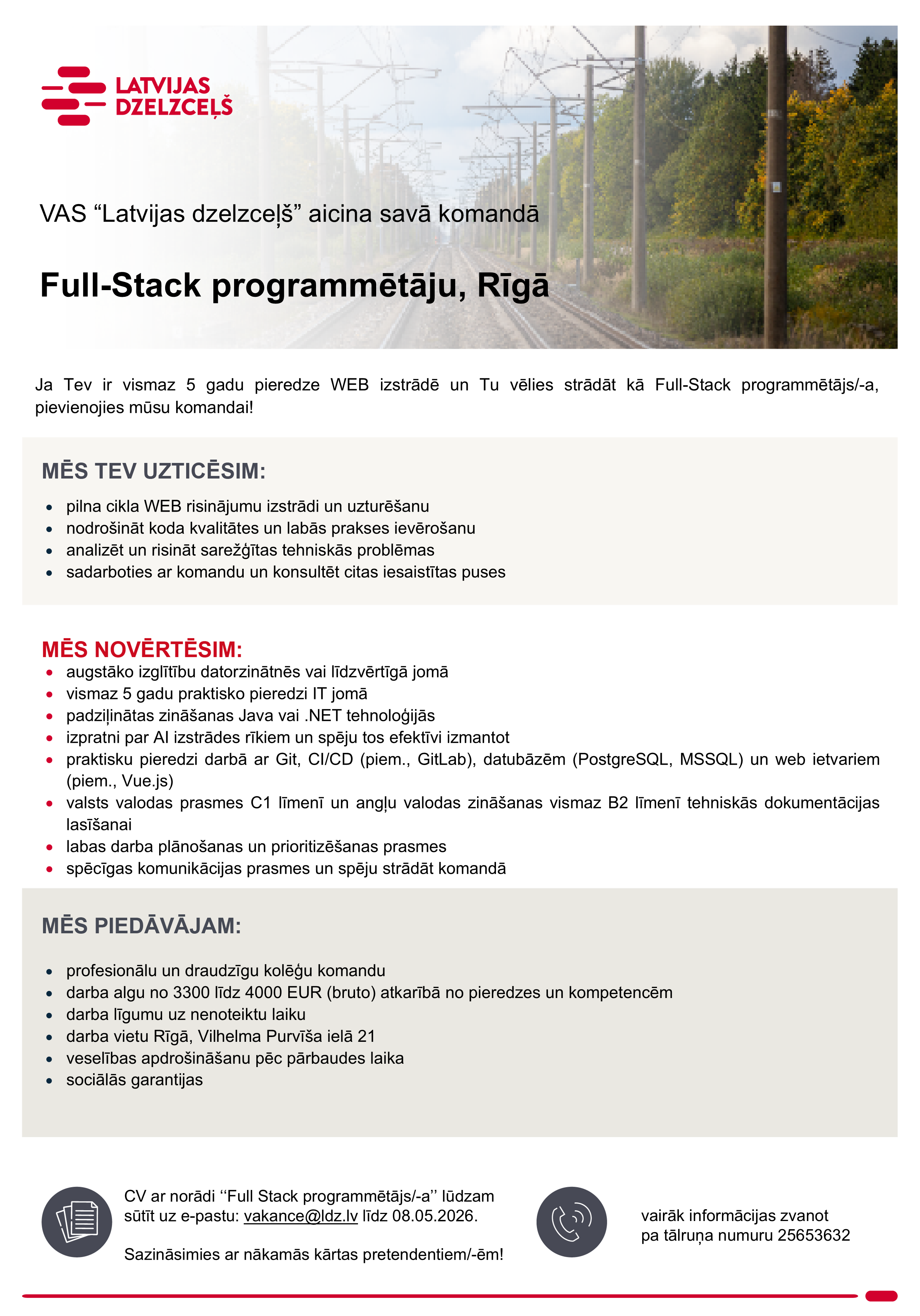 Piesakoties amata vakancei pretendents apliecina, ka sniegtie dati ir patiesi un piekrīt, ka Koncerns “Latvijas dzelzceļš” veiks šo datu apstrādi darbā iekārtošanās nolūkā. Mēs iesniegtos datus uzglabāsim VAS “Latvijas dzelzceļš” datu bāzē 1 gadu pēc konkursa beigām ar mērķi nodrošināt savu tiesību aizsardzību. Iesūtot datus, pretendents var izteikt piekrišanu savu datu uzglabāšanai Koncerna “Latvijas dzelzceļš” datu bāzē 1 gadu, lai tos izmantotu arī citos Koncerna “Latvijas dzelzceļš” sabiedrībās piemērotu vakanču personāla atlases procesos. Pēc pretendenta pieprasījuma, personas dati var tikt dzēsti jebkurā brīdī, informāciju sūtot e-pastu – datuaizsardziba[at]ldz.lv.Privātuma politika.