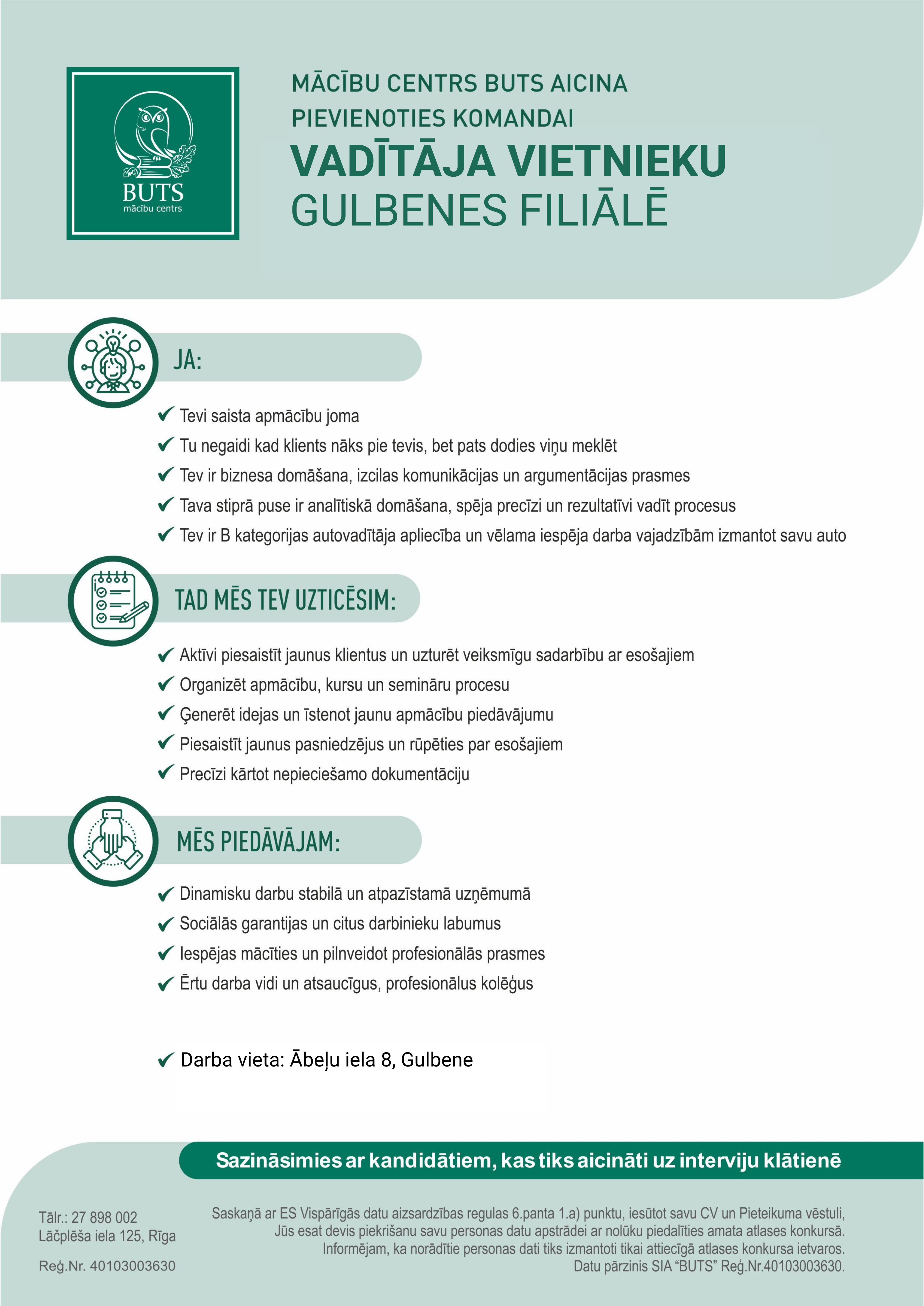 CV un pieteikuma vēstuli sūtīt uz e-pastu: gulbene[at]buts.lv