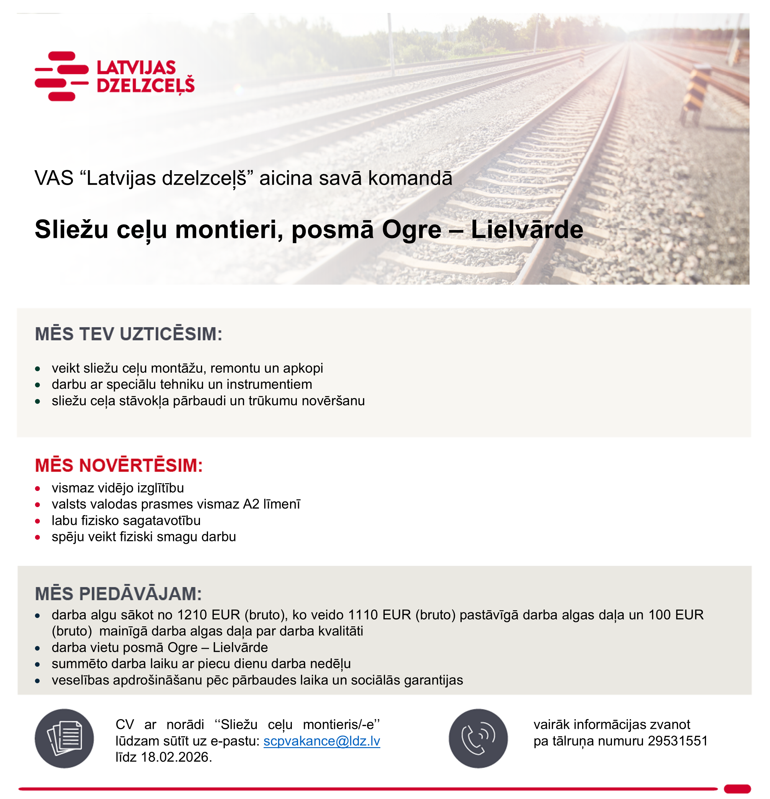 Piesakoties amata vakancei pretendents apliecina, ka sniegtie dati ir patiesi un piekrīt, ka Koncerns “Latvijas dzelzceļš” veiks šo datu apstrādi darbā iekārtošanās nolūkā. Mēs iesniegtos datus uzglabāsim VAS “Latvijas dzelzceļš” datu bāzē 1 gadu pēc konkursa beigām ar mērķi nodrošināt savu tiesību aizsardzību. Iesūtot datus, pretendents var izteikt piekrišanu savu datu uzglabāšanai Koncerna “Latvijas dzelzceļš” datu bāzē 1 gadu, lai tos izmantotu arī citos Koncerna “Latvijas dzelzceļš” sabiedrībās piemērotu vakanču personāla atlases procesos. Pēc pretendenta pieprasījuma, personas dati var tikt dzēsti jebkurā brīdī, informāciju sūtot e-pastu – datuaizsardziba[at]ldz.lv.Privātuma politika.