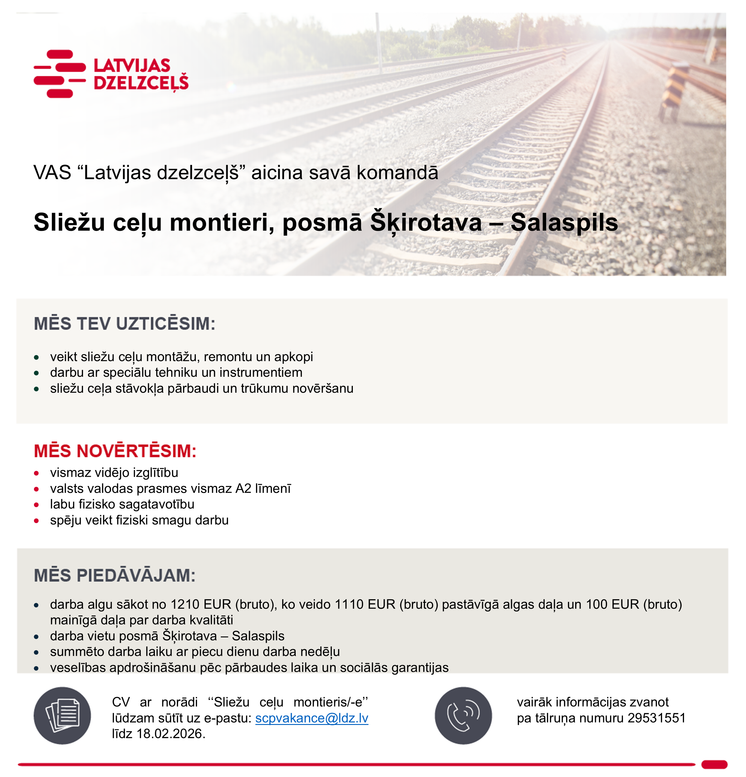 Piesakoties amata vakancei pretendents apliecina, ka sniegtie dati ir patiesi un piekrīt, ka Koncerns “Latvijas dzelzceļš” veiks šo datu apstrādi darbā iekārtošanās nolūkā. Mēs iesniegtos datus uzglabāsim VAS “Latvijas dzelzceļš” datu bāzē 1 gadu pēc konkursa beigām ar mērķi nodrošināt savu tiesību aizsardzību. Iesūtot datus, pretendents var izteikt piekrišanu savu datu uzglabāšanai Koncerna “Latvijas dzelzceļš” datu bāzē 1 gadu, lai tos izmantotu arī citos Koncerna “Latvijas dzelzceļš” sabiedrībās piemērotu vakanču personāla atlases procesos. Pēc pretendenta pieprasījuma, personas dati var tikt dzēsti jebkurā brīdī, informāciju sūtot e-pastu – datuaizsardziba[at]ldz.lv. Vairāk informācijas par personu datu apstrādi: Privātuma politika.