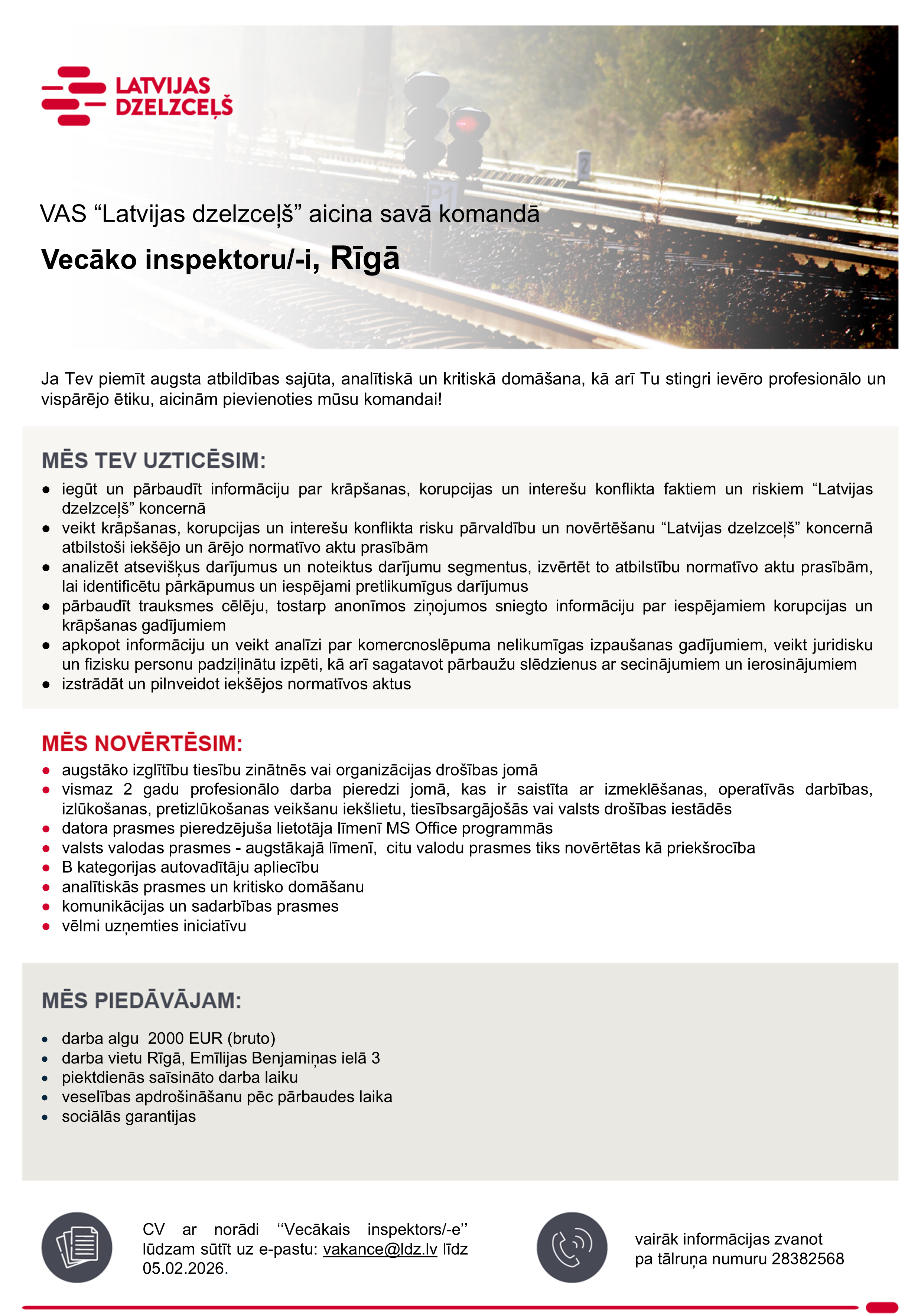 Piesakoties amata vakancei pretendents apliecina, ka sniegtie dati ir patiesi un piekrīt, ka Koncerns “Latvijas dzelzceļš” veiks šo datu apstrādi darbā iekārtošanās nolūkā. Mēs iesniegtos datus uzglabāsim VAS “Latvijas dzelzceļš” datu bāzē 1 gadu pēc konkursa beigām ar mērķi nodrošināt savu tiesību aizsardzību. Iesūtot datus, pretendents var izteikt piekrišanu savu datu uzglabāšanai Koncerna “Latvijas dzelzceļš” datu bāzē 1 gadu, lai tos izmantotu arī citos Koncerna “Latvijas dzelzceļš” sabiedrībās piemērotu vakanču personāla atlases procesos. Pēc pretendenta pieprasījuma, personas dati var tikt dzēsti jebkurā brīdī, informāciju sūtot e-pastu – datuaizsardziba[at]ldz.lv.Privātuma politika.
