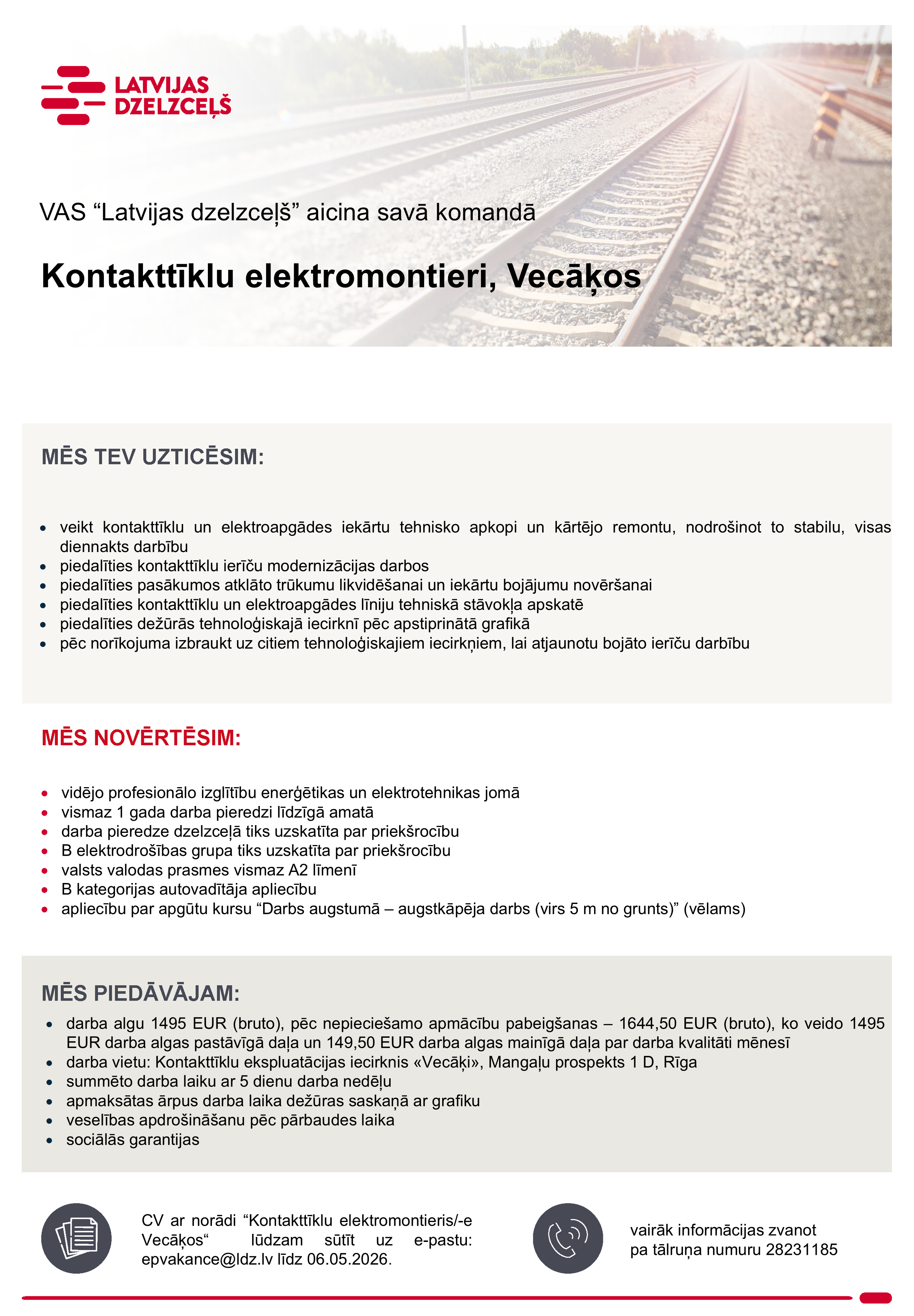 Piesakoties amata vakancei pretendents apliecina, ka sniegtie dati ir patiesi un piekrīt, ka Koncerns “Latvijas dzelzceļš” veiks šo datu apstrādi darbā iekārtošanās nolūkā. Mēs iesniegtos datus uzglabāsim VAS “Latvijas dzelzceļš” datu bāzē 1 gadu pēc konkursa beigām ar mērķi nodrošināt savu tiesību aizsardzību. Iesūtot datus, pretendents var izteikt piekrišanu savu datu uzglabāšanai Koncerna “Latvijas dzelzceļš” datu bāzē 1 gadu, lai tos izmantotu arī citos Koncerna “Latvijas dzelzceļš” sabiedrībās piemērotu vakanču personāla atlases procesos. Pēc pretendenta pieprasījuma, personas dati var tikt dzēsti jebkurā brīdī, informāciju sūtot uz e-pastu – datuaizsardziba[at]ldz.lv.Privātuma politika.